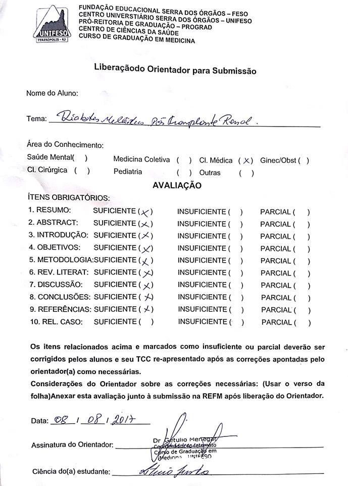 Conclusão: O estudo realizado com os prontuários corrobora com os dados apresentados pela revisão de literatura quanto aos fatores de risco que predispõem ao NODAT e que esses fatores, somados ao tipo de medicamento imunossupressor, têm importância crucial para o desenvolvimento dessa doença. Por esse motivo, é de extrema importância conhecer tanto os fatores de risco que possam ser apresentados pelo transplantado, quanto avaliar quais os medicamentos utilizados, visto que alguns possuem propriedades menos diabetôgenicas do que outros, ou simplesmente não possuem essa propriedade.